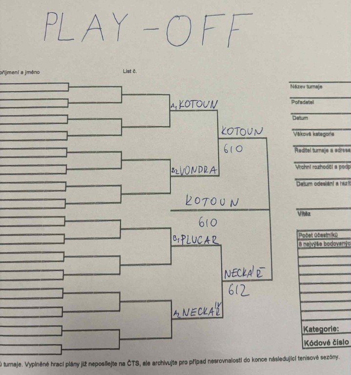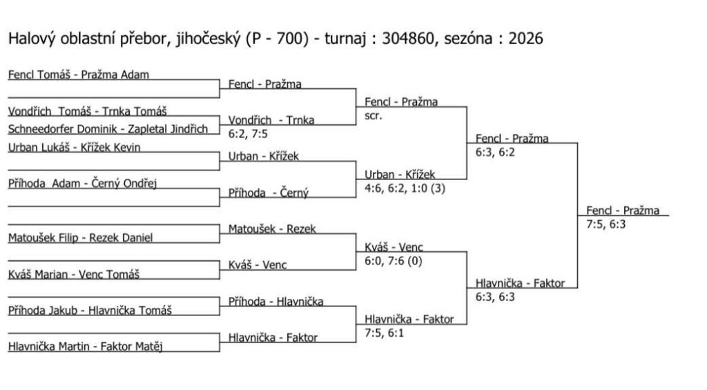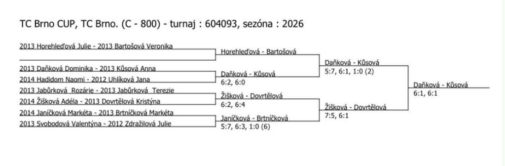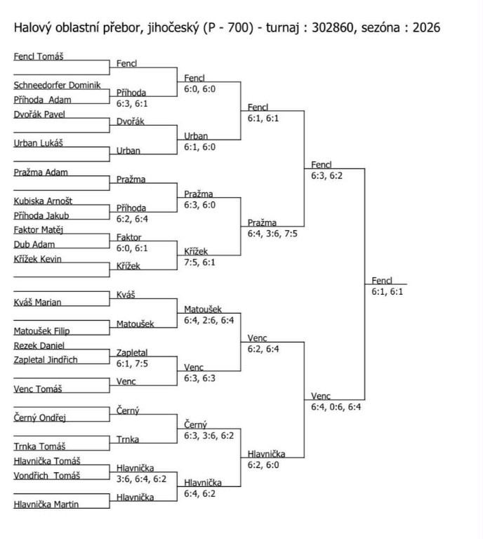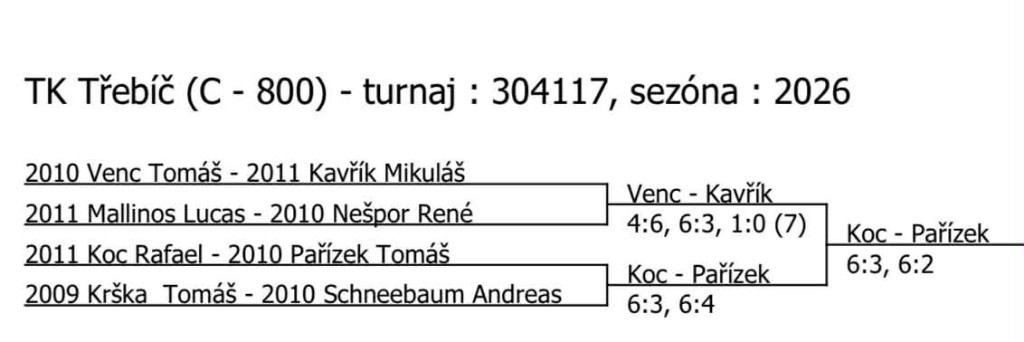 finále dvouhry KP dorostenců v Pelhřimově: Fencl T. - Venc T. 6:1, 6:1 3. místo na KP dorostenců ve čtyřhře: Kváš M. - Venc T. pavouk dvouhry KP dorost - Pelhřimov pavouk čtyřhry KP dorost - Pelhřimov babytenisté Ondra Němec a Mára Vondra babytenis Tábor - skupina A babytenis Tábor - skupina B pavouk KP v kategorii babytenis babytenis - útěcha 2. místo v deblu st. žákyň pro Kiki Dovrtělovou (spolu s Žiškovou A.) pavouk čtyřhry st. žákyň - Brno finále dvouhry dorostu v Třebíči: Koc R. - Venc T. 6:7, 6:2 1:0 (2) Finále ve čtyřhře dorostenců v Třebíči: Kavřík M., Venc T. - Koc, Pařízek 3:6, 2:6 3. místo ve dvouhře dorostu v Třebíči - Miki Kavřík 2. místo ve čtyřhře dorostu v Třebíči: Kavřík M. - Venc T. pavouk dvouhry dorost - Třebíč pavouk čtyřhry dorost - Třebíč