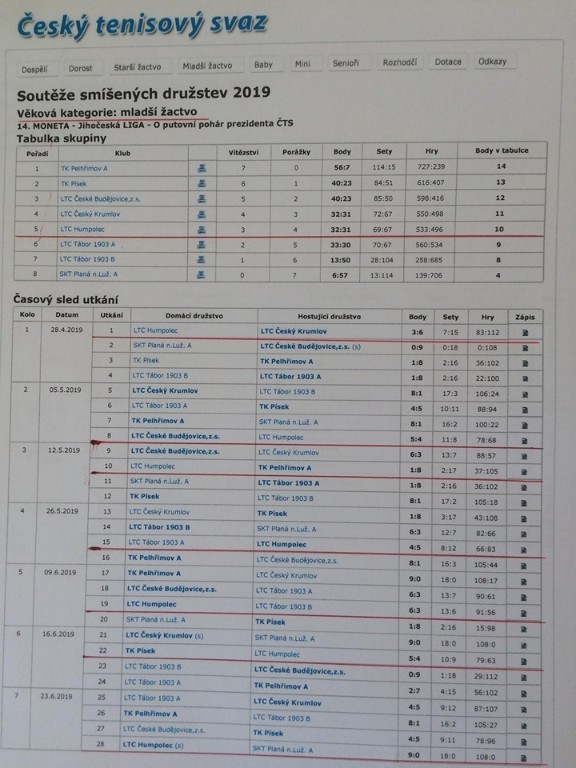 Dospělí: TJ TK Mane Hluboká n. Vlt. : LTC Humpolec A 3:6, LTC Humpolec B : Jiskra Bechyně B 5:4