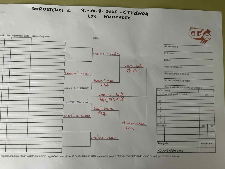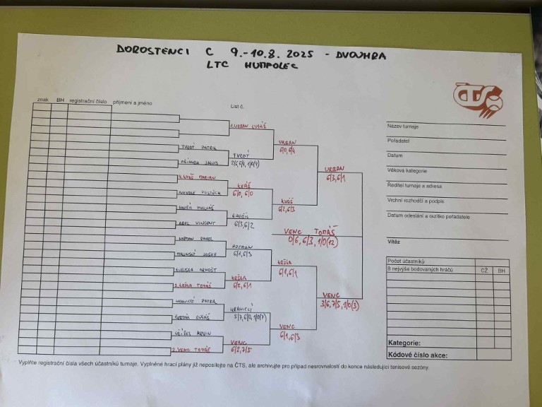 O víkendu 9. - 10. srpna se na humpoleckých kurtech konal turnaj dorostu. Na turnaji se představili čtyři domácí hráči a všichni alespoň jednou vyhráli. Nejvíce se dařilo Marimu Kvášovi a Tomu Vencovi. Marian došel až do semifinále, kde podlehl nasazené jedničce Lukáši Urbanovi 3:6 1:6. Ve finále se proti Urbanovi postavil Tom. Po dvou setech 0:6 6:3 bylo jasné, že o vítězi rozhodne supertiebreak. Tom odvrátil dva matchbaly a vyhrál 14:12. Získal tak svůj první letošní titul! Kluci spolu vyhráli také celou čtyřhru. Třetí ve čtyřhře skončil také Miki Kavřík se svým parťákem Arnoštem Kubiskou.