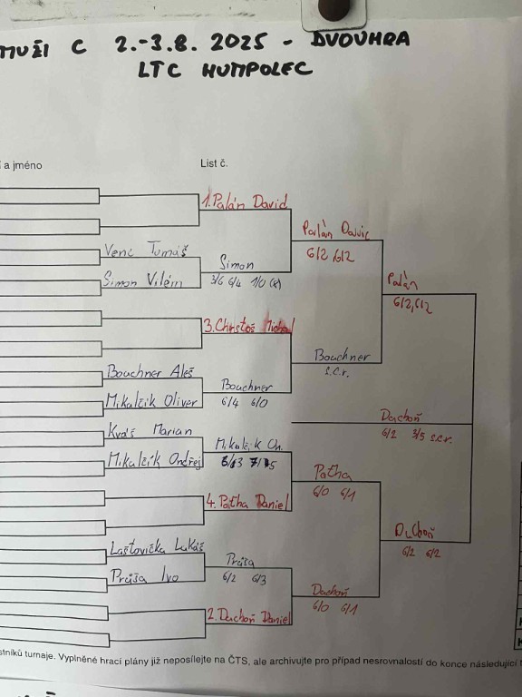 První víkend v srpnu patřil také domácímu turnaji mužů. V něm se nejvíce dařilo Davidu Palánovi, který dokráčel do finále, kde nestačil na Daniela Duchoně. David v semifinále porazil dalšího domácího hráče Aleše Bouchnera, který si tak připsal také skvělý výsledek. Ve čtyřhře se dařilo Tomáši Vencovi a Marianu Kvášovi, kteří si zahráli finále.
